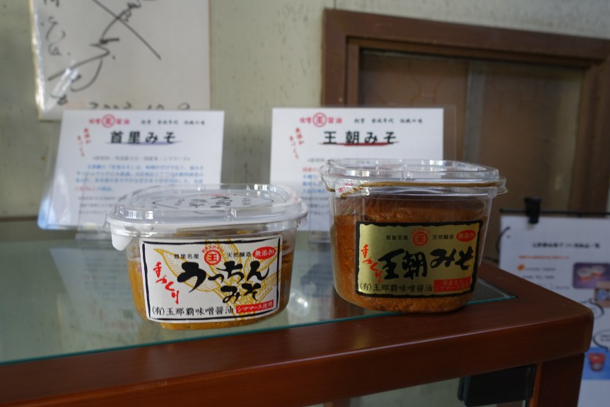 Tamanaha has been making miso since the Ryukyu Kingdom period. This miso warehouse is less than a 10-minute walk from Gibo station. The warehouse has an old exterior with a white sign “味噌醤油” (miso soy sauce) on the door. The miso here is produced through natural fermentation without additives. They sell four kinds of miso, and the information is available on their website.