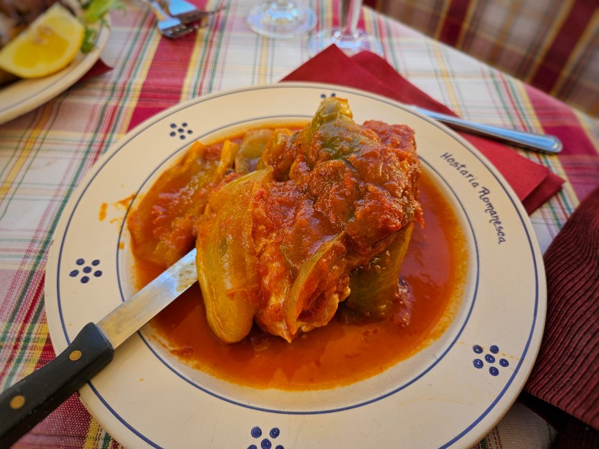 The menu offers a simple selection of antipasti, pasta, secondi, and desserts. I ordered a Carciofo alla Romana (Fried artichoke), Rigatoni all’Amatriciana (Rigatoni with bacon, hot pepper, tomato, and Roman cheese), and a Tiramisu.