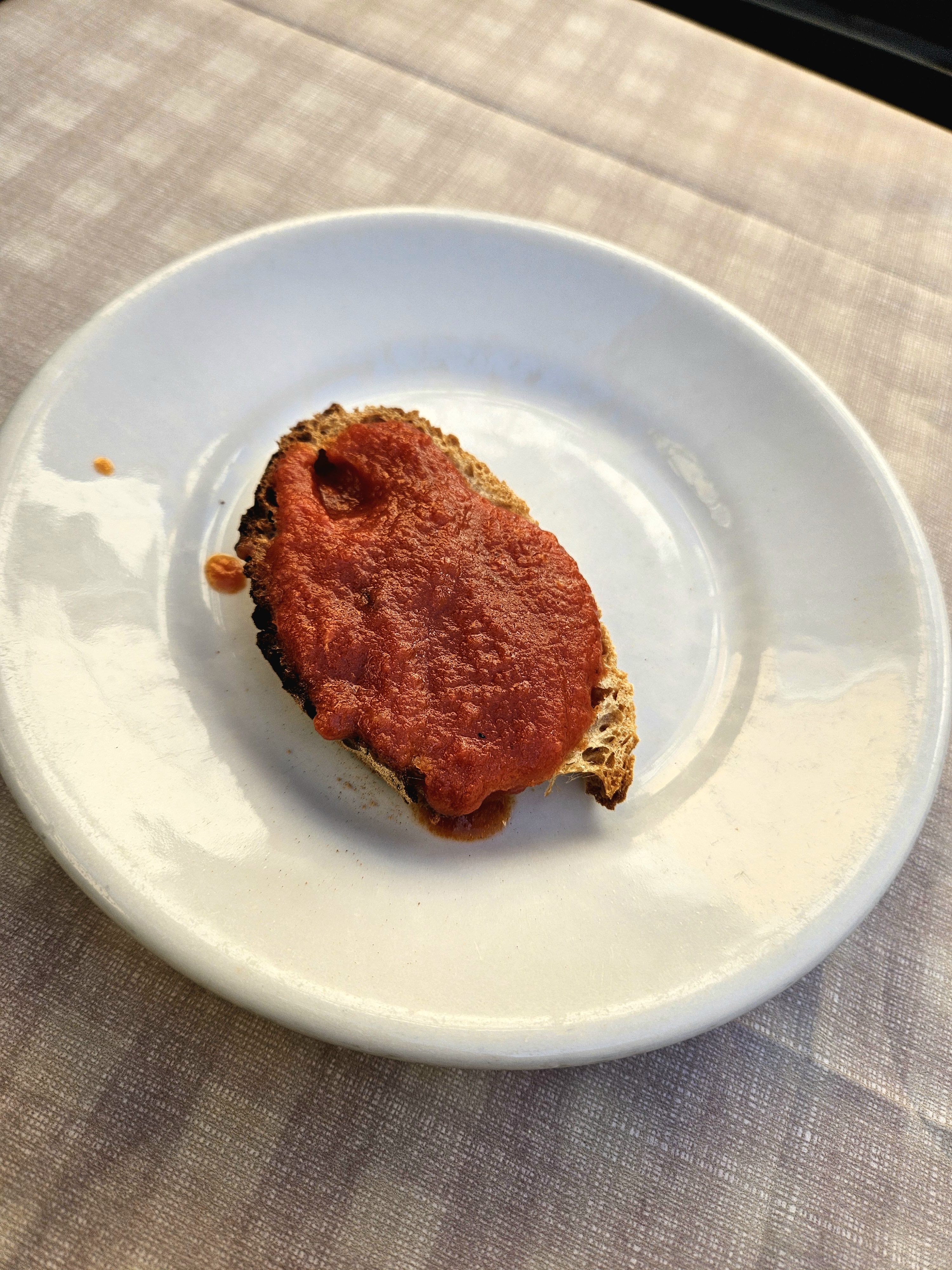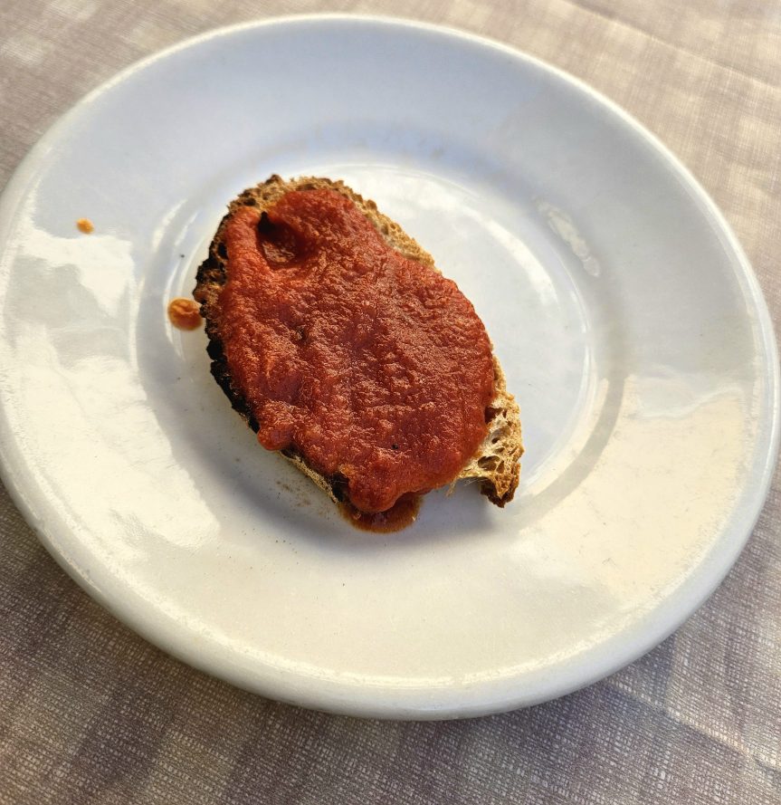 As I waited for my meal, they brought out a bruschetta. It was amazing—the warm bread with a fresh, pureed tomato topping was just perfect.