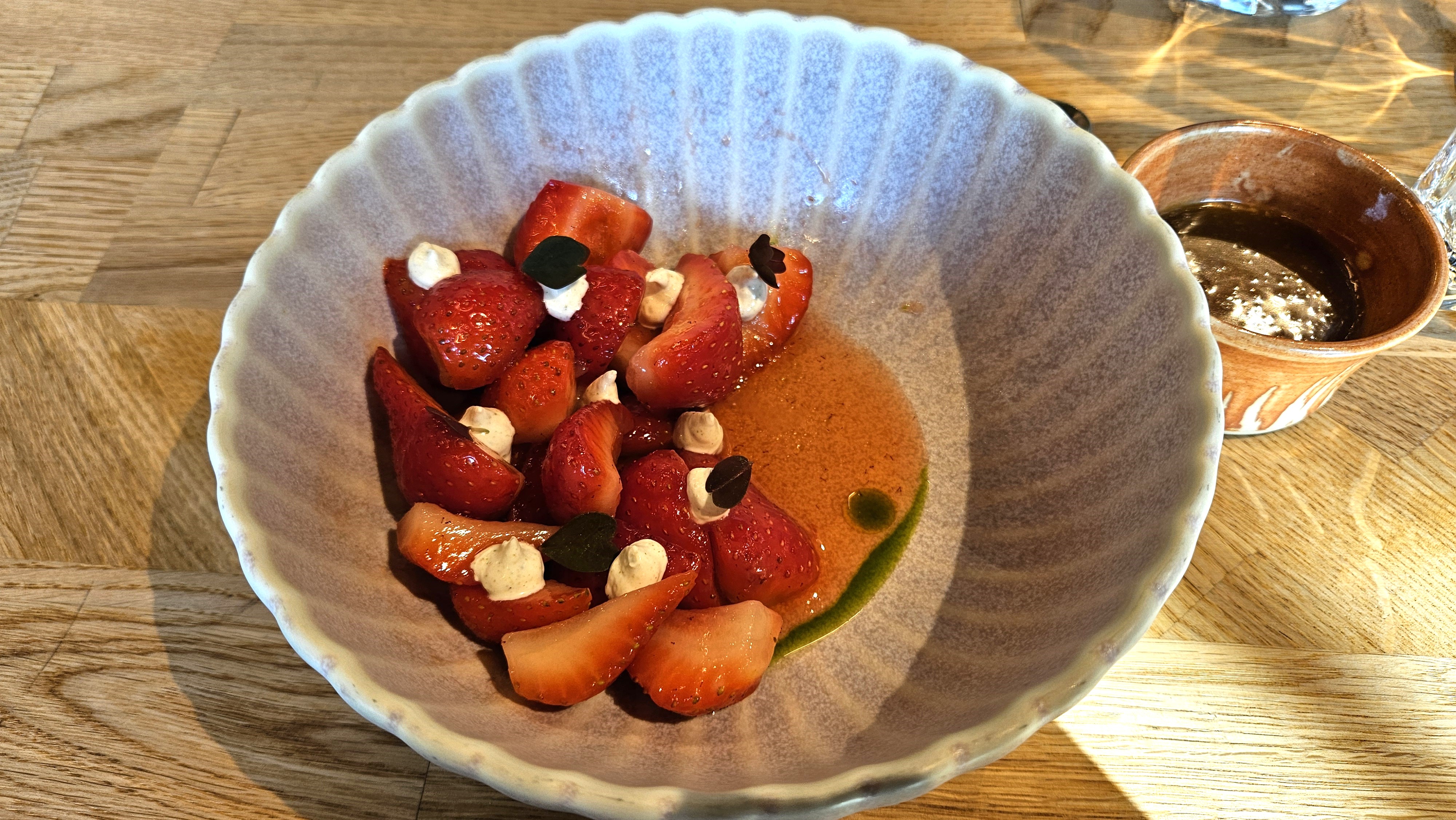 For dessert, I enjoyed fresh strawberries topped with cream and a warm caramel sauce. The dish had a nice balance of flavors— the strawberries were slightly sour, the caramel added a touch of saltiness, and the cream had a mild, slightly sweet taste that brought it all together.