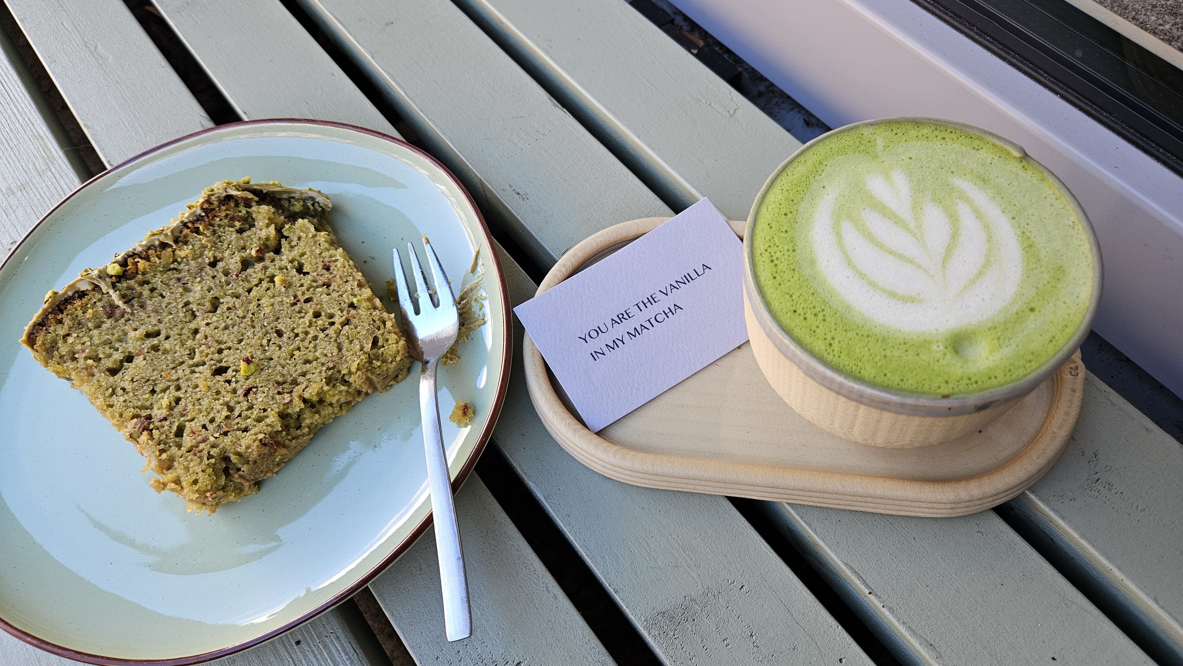 I ordered an oat milk matcha latte and a pistachio loaf. The matcha had a pleasant flavor, though I personally prefer a stronger matcha taste. The pistachio loaf itself was mildly sweet with a slightly dry texture, but the pistachio frosting truly tied it all together, adding a rich nuttiness and just the right amount of sweetness.