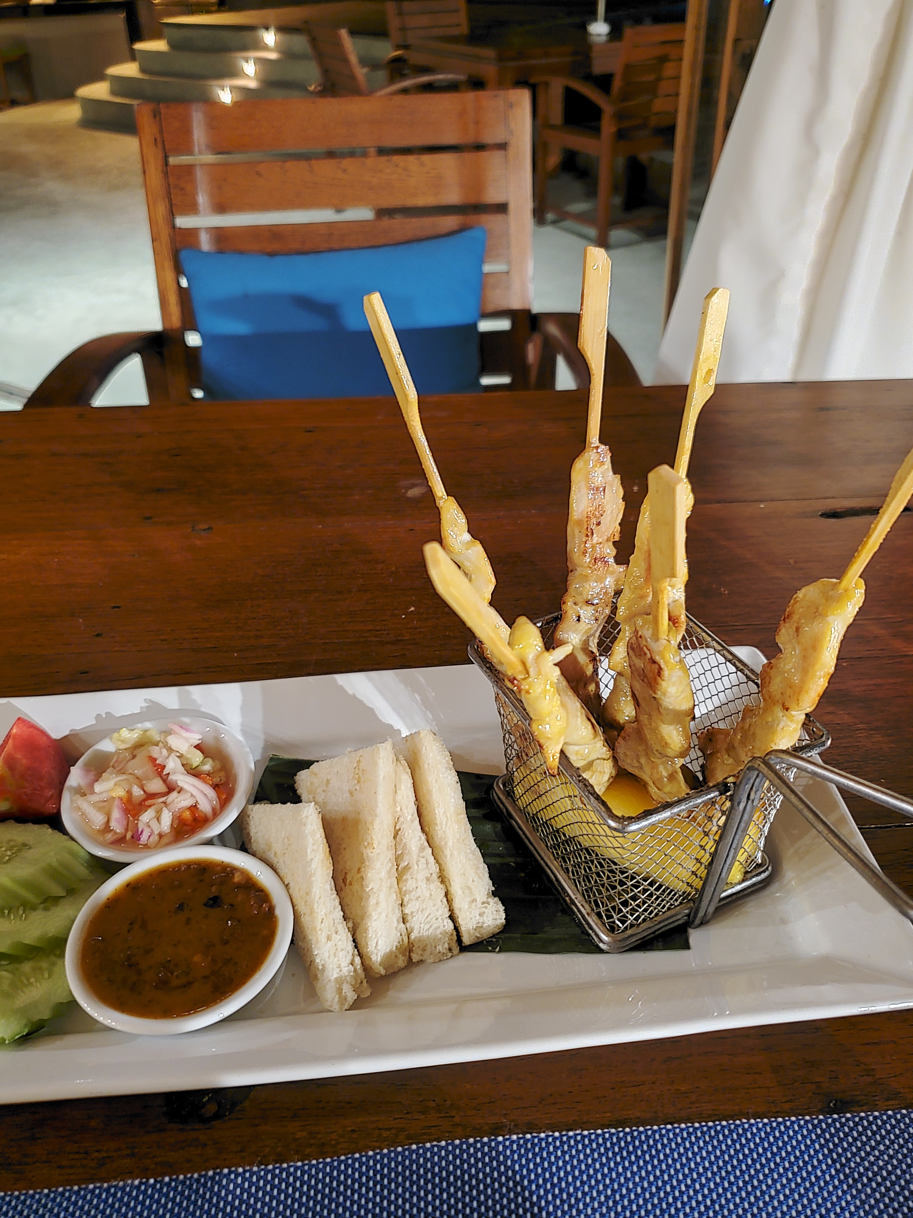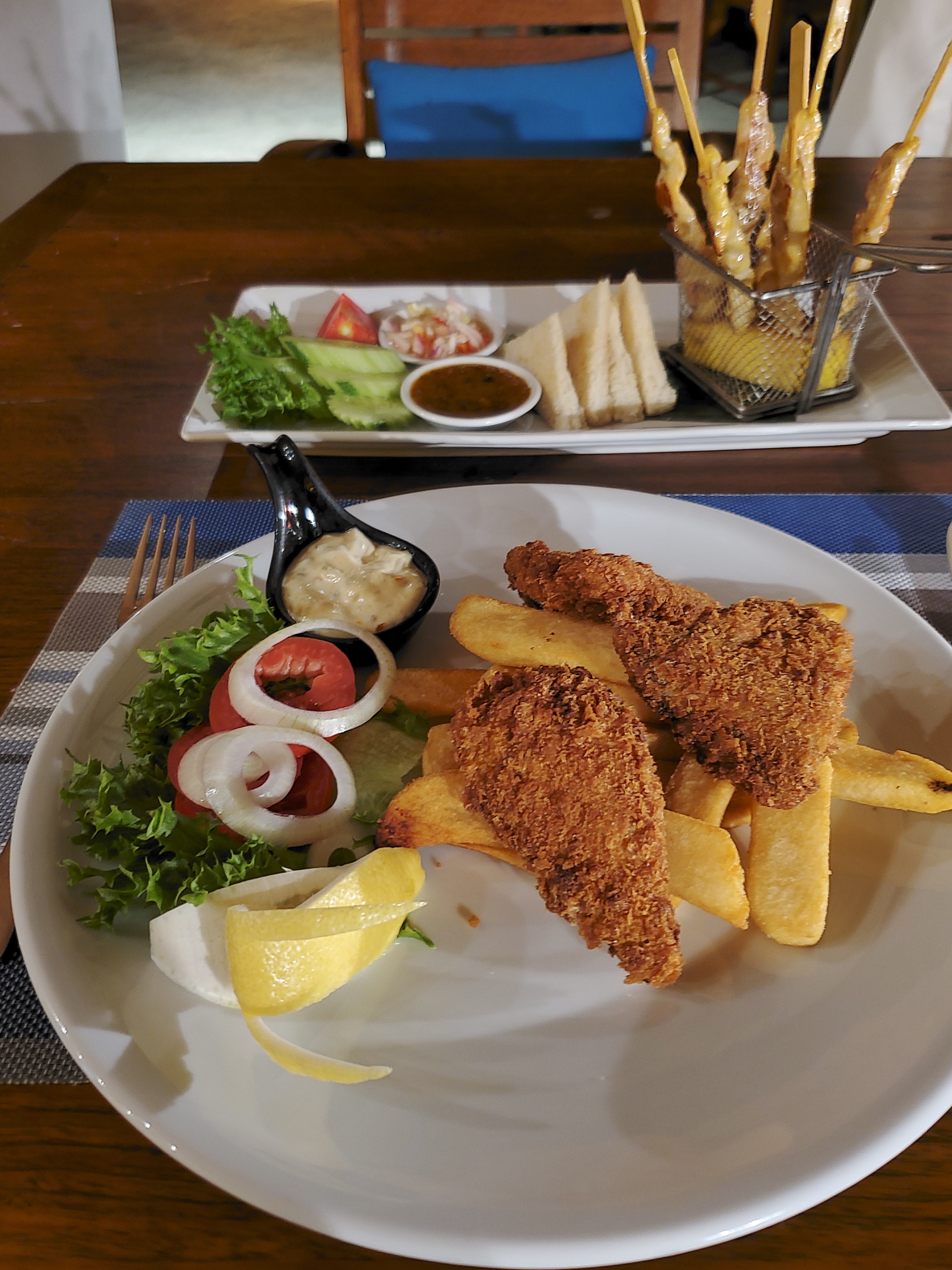 The fish and chips were dry, and the fish was over-fried. The chicken satay tasted bland.